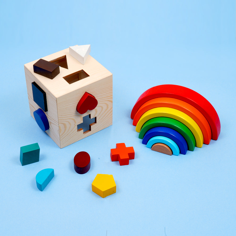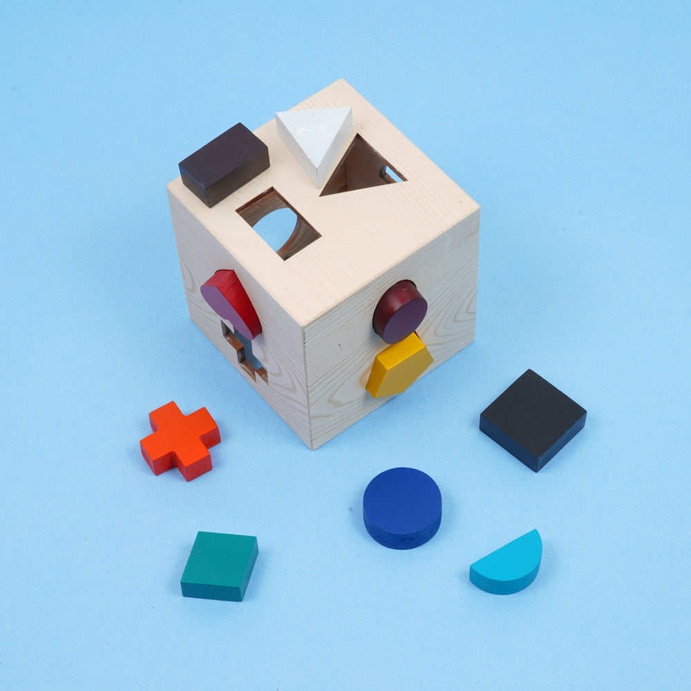 This cube puzzle is a must-have shape sorter with different geometric shapes ideal for pincer grip and cognitive development.
